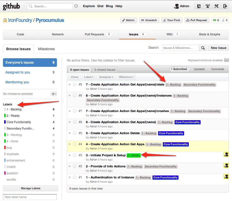 For now I’ve primarily been just adding the issues and maintaining them via the Github web interface. However the items can be moved via commit messages. Here are some examples;