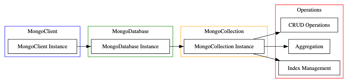 The arrows indicate the flow of interaction, starting from the MongoClient instance to the database, then to the collections, and finally to the operations performed on these collections.